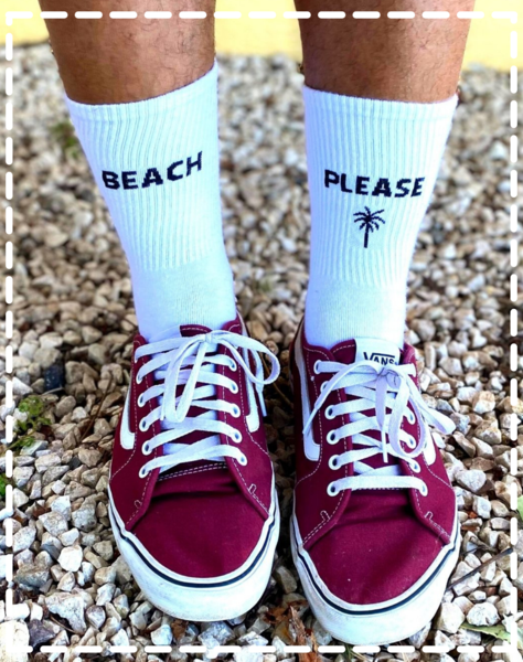 Paire de chaussette blanche unisexe en coton avec inscription message “BEACH PLEASE”.