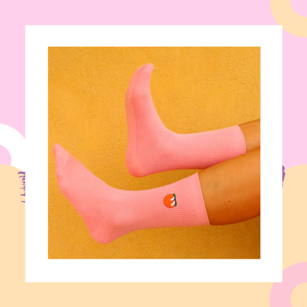 Chaussettes roses unisexe en coton avec motif pêche brodé.